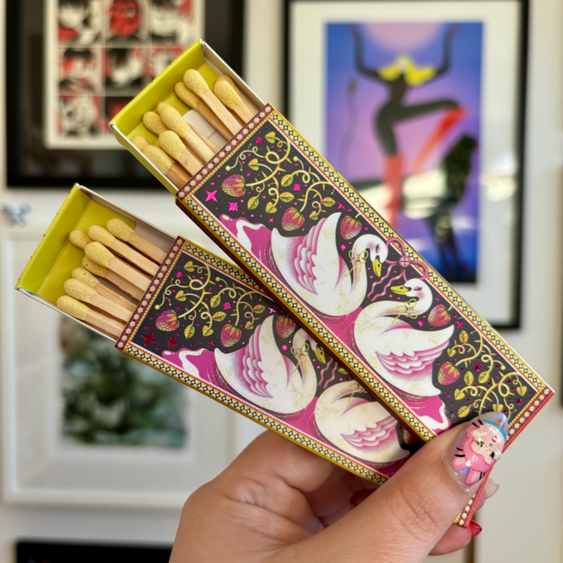 The matchbox artwork is an original illustration by the talented Jasmine Floyd. Two swans facing each other, their graceful necks forming a gentle heart shape. Nestled around them are plump, ripe strawberries hanging from curling green vines. This matchbox design exudes a delicate tenderness and features fuchsia foil highlights.
